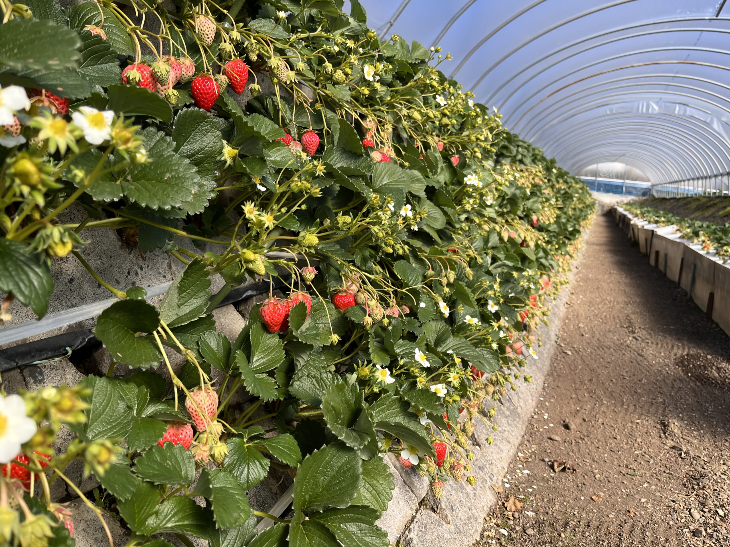 駿河湾に面した国道150号線沿いの「久能街道・いちご海岸通り」は、石垣栽培で育てるいちごの名所。数多くのいちご農園が並びます。