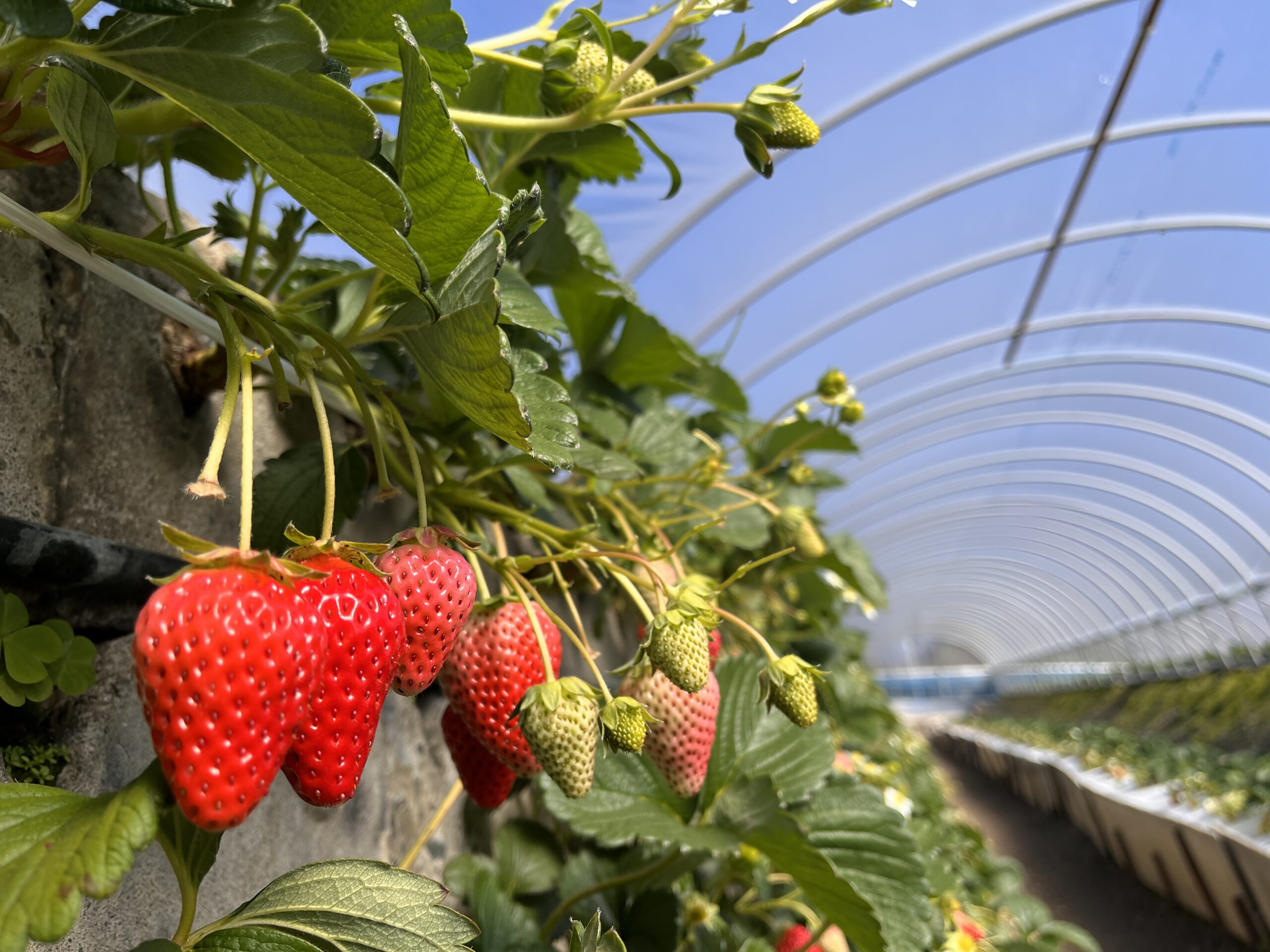 石垣いちごは、温暖な気候や豊富な日光を活かし、石垣(コンクリート)に蓄積した太陽熱で育てることで、12月から年明け5月頃まで、甘いいちごを味わうことができます。
