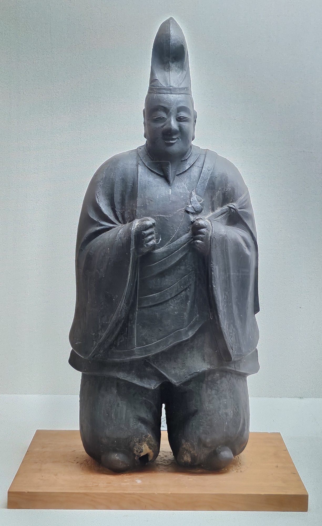 伊豆山神社には走湯権現立像[県指定彫刻]が伝わります。背面銘文に、明徳3年(1392)の製作年や製作に係った人の名が記されています。穏やかな表情で、立烏帽子を被り、袍に指貫、袈裟をかけた姿は、七福神の恵比寿さまを思わせます。