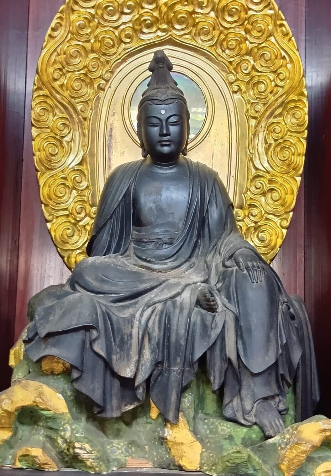 本像とともに北條寺に伝わるのは、観音菩薩坐像[県指定彫刻]です。左足をおろし、右足を前にはずして座り、右手を後ろ手についてくつろいでいるような様子は、宋風を感じます。
