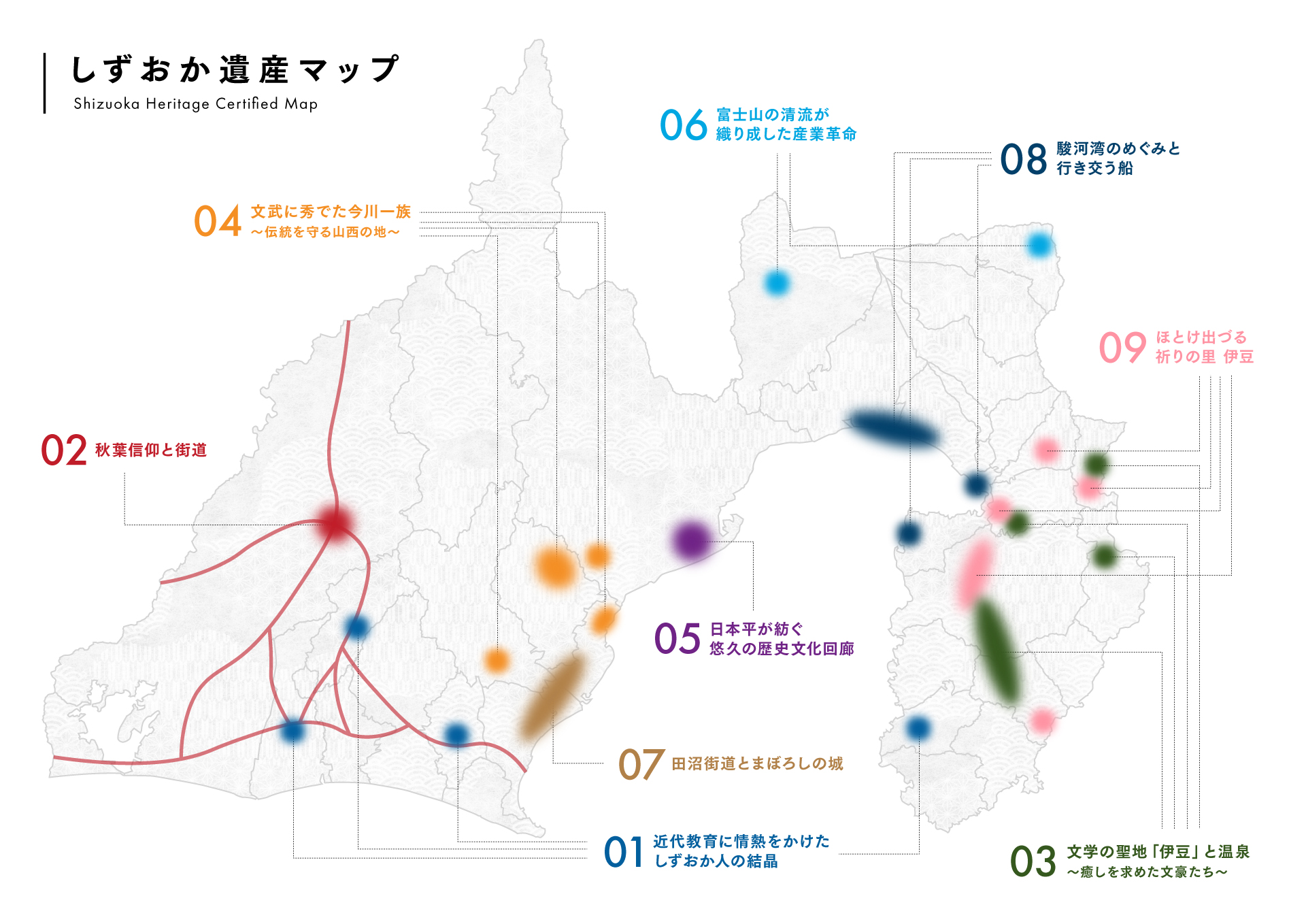 県では、県内にある有形・無形の文化財を結びつけた魅力的なストーリー「しずおか遺産」を9つ認定しています。
